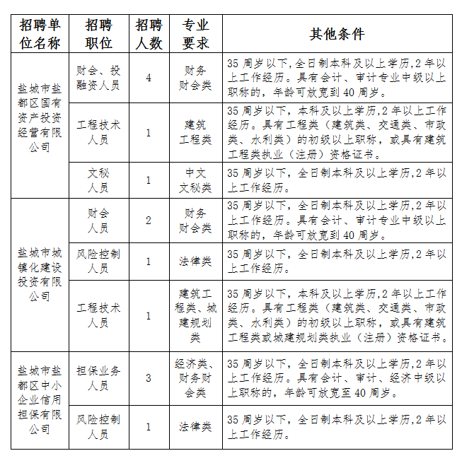 根據(jù)工作需要,鹽城市鹽都區(qū)財政局直屬國有企業(yè)鹽城市鹽都區(qū)國有資產(chǎn)投資經(jīng)營有限公司、鹽城市城鎮(zhèn)化建設(shè)投資有限公司、鹽城市鹽都區(qū)中小企業(yè)信用擔保有限公司決定面向社會公開招聘工作人員。現(xiàn)將有關(guān)事項公告如下: