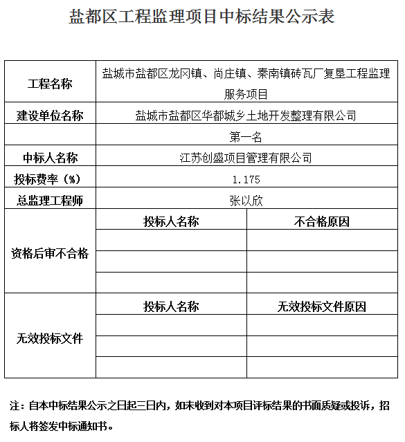 鹽城市鹽都區(qū)龍岡鎮(zhèn)、尚莊鎮(zhèn)、秦南鎮(zhèn)磚瓦廠復(fù)墾工程監(jiān)理服務(wù)項目中標結(jié)果公示