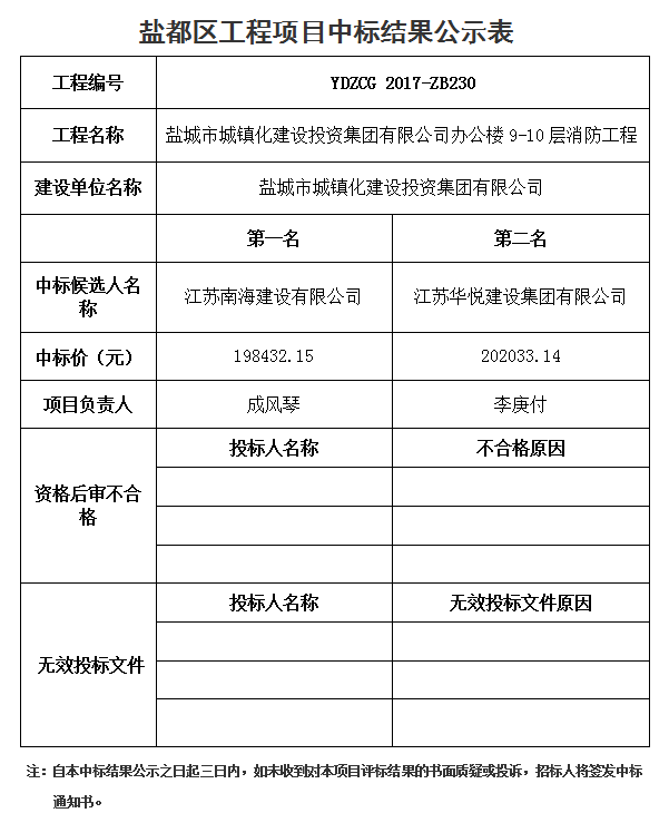 鹽城市城鎮(zhèn)化建設投資集團有限公司辦公樓9-10層消防工程中標結果公示