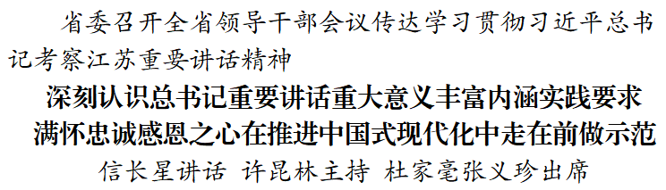 信長(zhǎng)星在講話中說(shuō),江蘇一直是習(xí)近平總書(shū)記的關(guān)注點(diǎn)、調(diào)研點(diǎn)和研究點(diǎn),總書(shū)記對(duì)江蘇的關(guān)注始終是進(jìn)行時(shí)。黨的十八大以來(lái),習(xí)近平總書(shū)記多次親臨江蘇考察指導(dǎo),發(fā)表一系列重要講話、作出一系列重要指示,為江蘇發(fā)展精準(zhǔn)把脈、擘畫(huà)藍(lán)圖。當(dāng)前,中華民族偉大復(fù)興正在育新機(jī)、開(kāi)新局,全面建設(shè)社會(huì)主義現(xiàn)代化國(guó)家處在開(kāi)局起步的關(guān)鍵階段。習(xí)近平總書(shū)記再次深入江蘇考察,時(shí)隔4個(gè)月對(duì)江蘇工作作出新的重要指示,飽含著對(duì)江蘇人民的深情厚愛(ài)和巨大關(guān)懷,充分體現(xiàn)了對(duì)江蘇發(fā)展一以貫之的殷切期望和信任重托。這次考察,總書(shū)記著眼強(qiáng)國(guó)建設(shè)、民族復(fù)興,聚焦中國(guó)式現(xiàn)代化的重點(diǎn)領(lǐng)域提出一系列新思想新觀點(diǎn)新論斷,明確指出江蘇有能力也有責(zé)任在推進(jìn)中國(guó)式現(xiàn)代化中走在前、做示范,賦予我們?cè)诳萍紕?chuàng)新上取得新突破、在強(qiáng)鏈補(bǔ)鏈延鏈上展現(xiàn)新作為、在建設(shè)中華民族現(xiàn)代文明上探索新經(jīng)驗(yàn)、在推進(jìn)社會(huì)治理現(xiàn)代化上實(shí)現(xiàn)新提升的“四個(gè)新”重大任務(wù),并對(duì)“以學(xué)促干”作出深刻闡釋,給全省上下以極強(qiáng)的思想指引、精神鼓舞、奮斗感召,為新征程上江蘇應(yīng)該干什么、怎樣干得更好進(jìn)一步指明了前進(jìn)方向、提供了行動(dòng)指南、明確了目標(biāo)路徑。我們要滿懷忠誠(chéng)感恩之心,自覺(jué)從堅(jiān)定擁護(hù)“兩個(gè)確立”、堅(jiān)決做到“兩個(gè)維護(hù)”的高度,深入學(xué)習(xí)領(lǐng)會(huì)總書(shū)記重要講話精神,深刻把握蘊(yùn)含其中的重大政治意義、理論意義和實(shí)踐意義,胸懷“兩個(gè)大局”,牢記“國(guó)之大者”,把握“強(qiáng)省之要”,堅(jiān)定不移沿著總書(shū)記指引的方向勇毅前行,以當(dāng)表率、做示范、走在前的果敢擔(dān)當(dāng),奮力推進(jìn)中國(guó)式現(xiàn)代化江蘇新實(shí)踐,譜寫(xiě)“強(qiáng)富美高”新江蘇現(xiàn)代化建設(shè)新篇章。